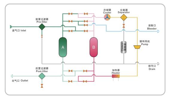 KCN干燥機應用變溫吸附原理,在常溫高水汽分壓下吸附,在較高溫、低水汽分壓下解析再生。當天然氣進入干燥機后,首先在前置過濾器中進行過濾,在進吸附塔A,氣體中的水分被分子篩吸附,成為干燥的成品氣,由后置過濾器過濾后輸出;在吸附塔A干燥的同時,在閥體的作用下,加熱器、吸附塔B、再生氣冷卻器、分離器和再生壓縮機形成閉式再生回路。回路中氣體由壓縮機加壓后至加熱器加熱,再到吸附塔B對飽和分子篩進行升溫解析,升溫解析結束后,高溫氣體再經壓縮機升壓后,經過冷卻器冷卻后的氣體在對吸附塔B里升溫解析后的分子篩進行吹冷并帶走分子篩里的水分,經過分離器后水分進入儲液罐,如此循環一定時間,對分子篩進行再生;再生后雙塔交替切換。